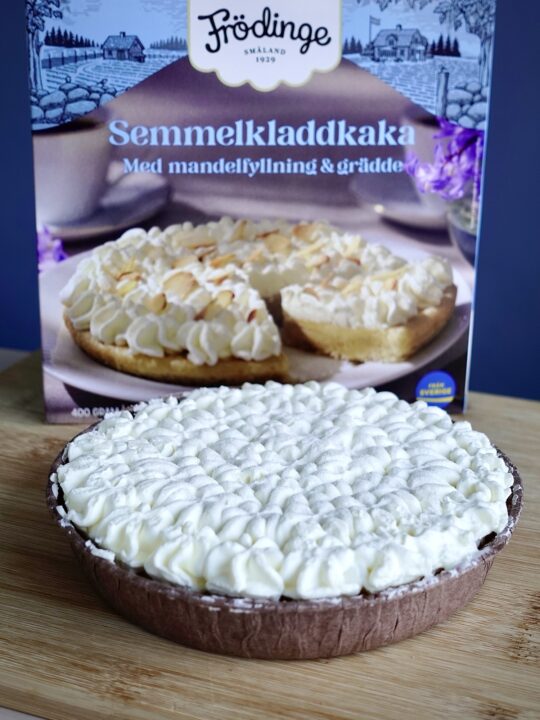 Frödinge Semmelkladdkaka med mandelfyllning och grädde finns nu ute i butik och vill ni ha en recension innan ni lägger ut en 50-lapp på att testa själv lyder den som följer.
